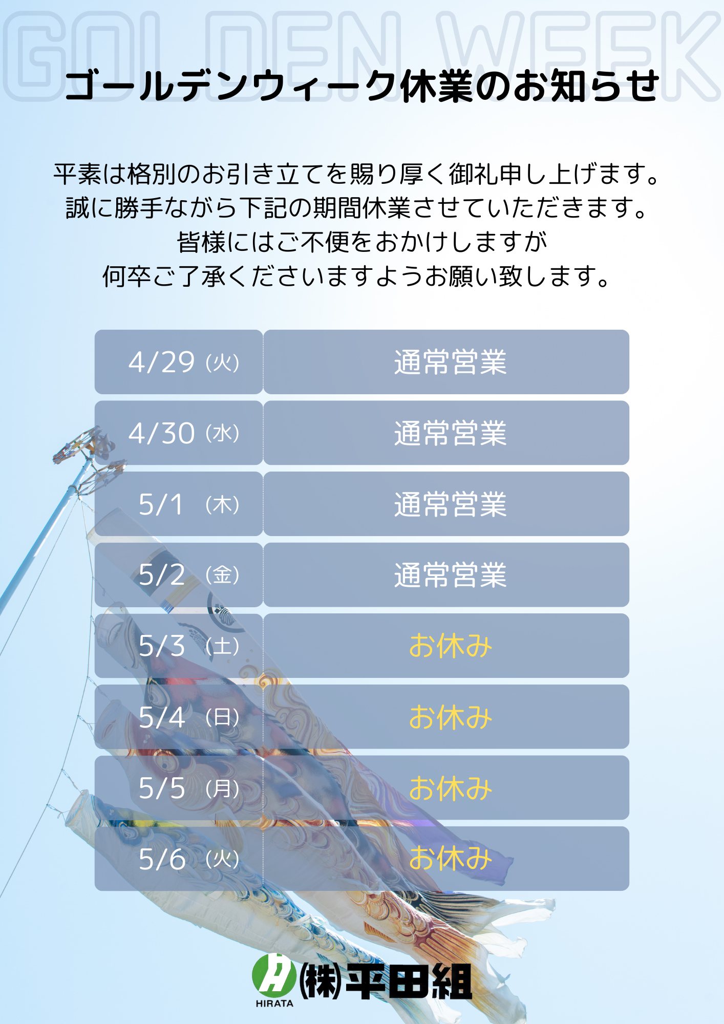 ゴールデンウィーク休業のお知らせ |